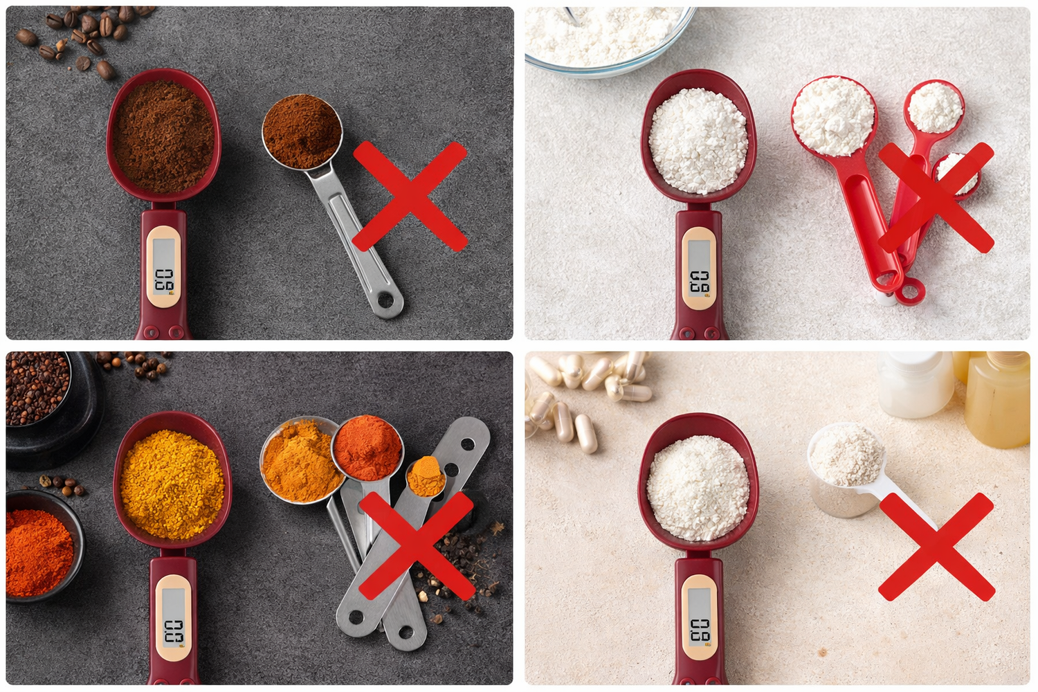 Tradycyjne łyżki miarowe zostały zaprojektowane z Mierzą objętość — a nie wagę — co oznacza, że wyniki różnią się w zależności od składnika. Mąka, cukier, przyprawy i suplementy mają różną...